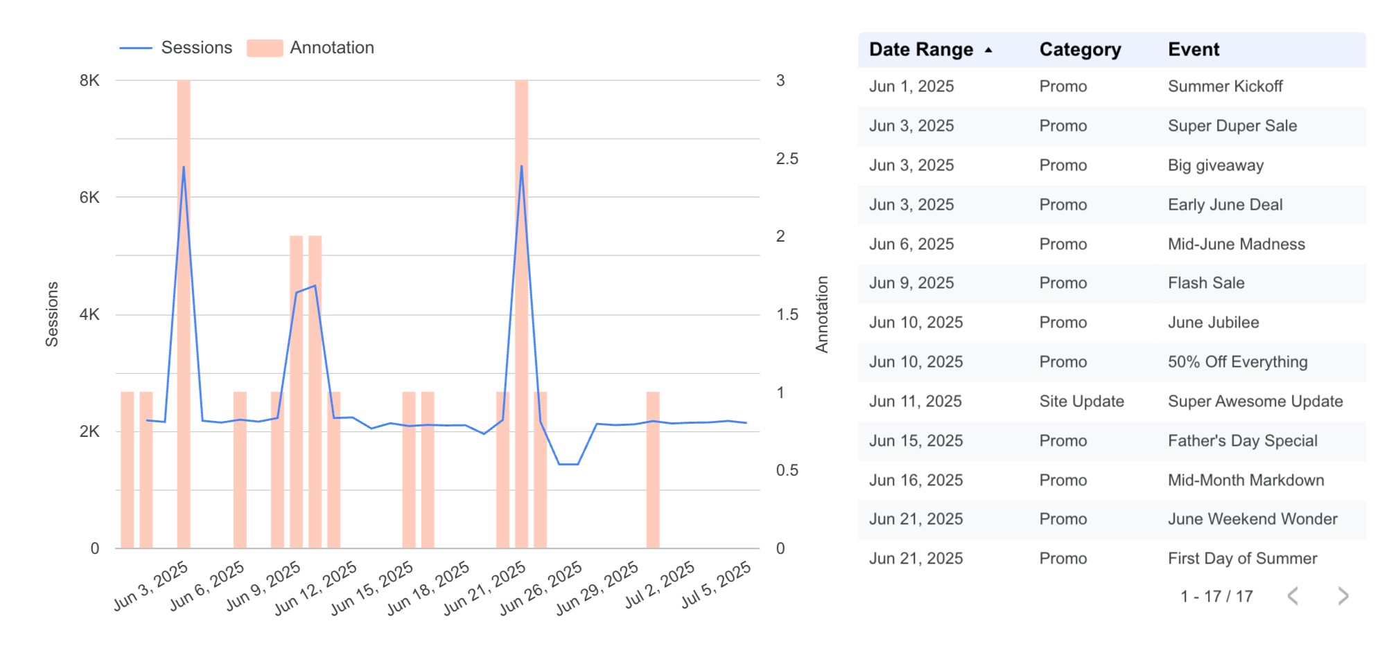 • Custom Visual Reporting: Display GA4 annotations with full context including titles, descriptions, dates, and custom categories